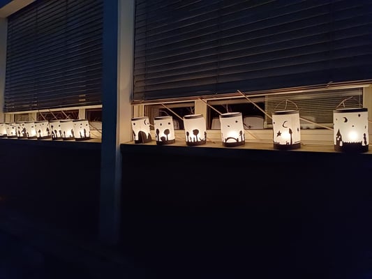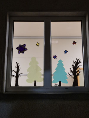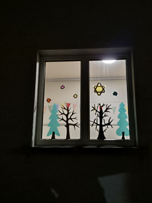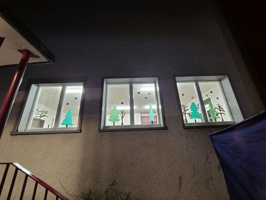 Passend zum "kleinsten Christkindlmarkt der Welt" gestalteten die Kinder der 1.+2. Klasse die Fenster im Parterre.