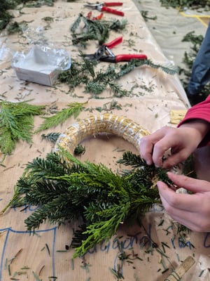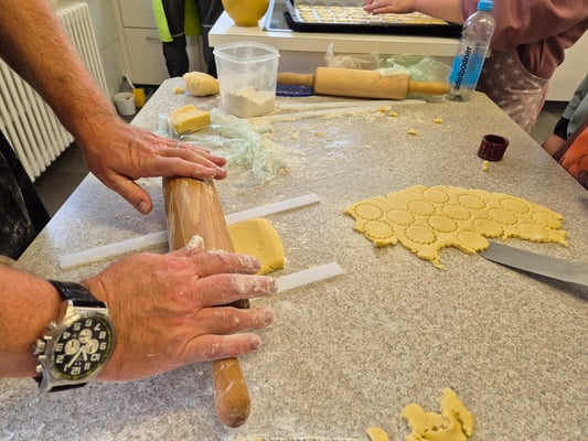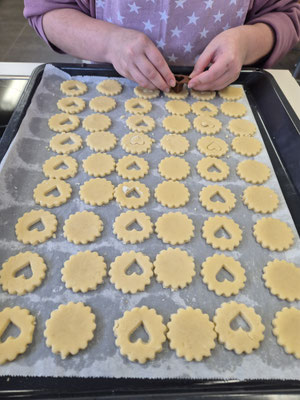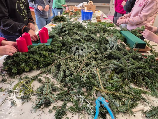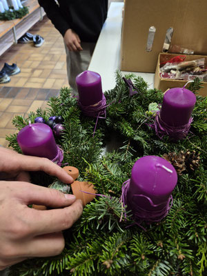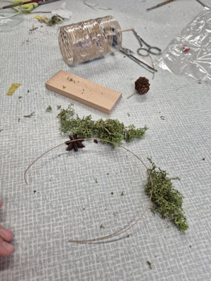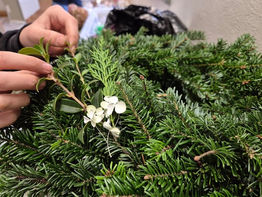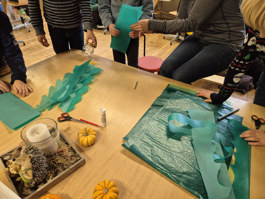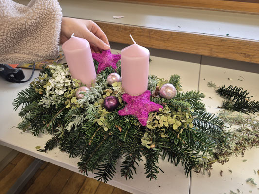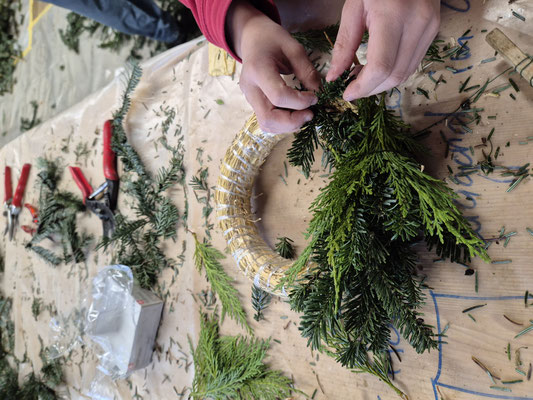 In verschiedenen Gruppen werden Weihnachtskränze und winterliche Gestecke, Dekorationen und feine Backwaren hergestellt.