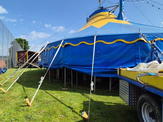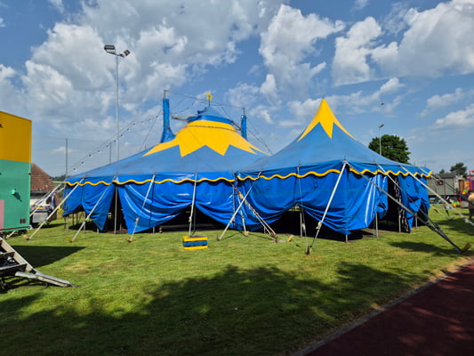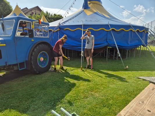 Am Montagmorgen wird das schöne blaugelbe Zirkuszelt aufgebaut, wobei die älteren Schulkinder beim Materialschleppen und Aufbau mithelfen dürfen.