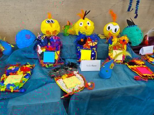 Zu Beginn des Schuljahres stellen jeweils alle Schülerinnen und Schülern eine gemeinsame Gestaltung für das Schulhaus her. In diesem Jahr liessen wir uns von den Puzzleteilchen im Logo inspirieren. Dazu gestaltete jede Klasse ihre Teile nach einem vorgegebenen Farbkonzept.