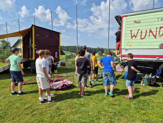 Am Nachmittag begrüsst uns das ganze Team des Wunderplunders, "Wundis" genannt, bereits im Zirkuszelt. Nach der Vorstellungsrunde lernen die Schulkinder auf einem Rundgang die verschiedenen Disziplinen kennen. Die Angebote für die 1. - 9. Klasse sind: